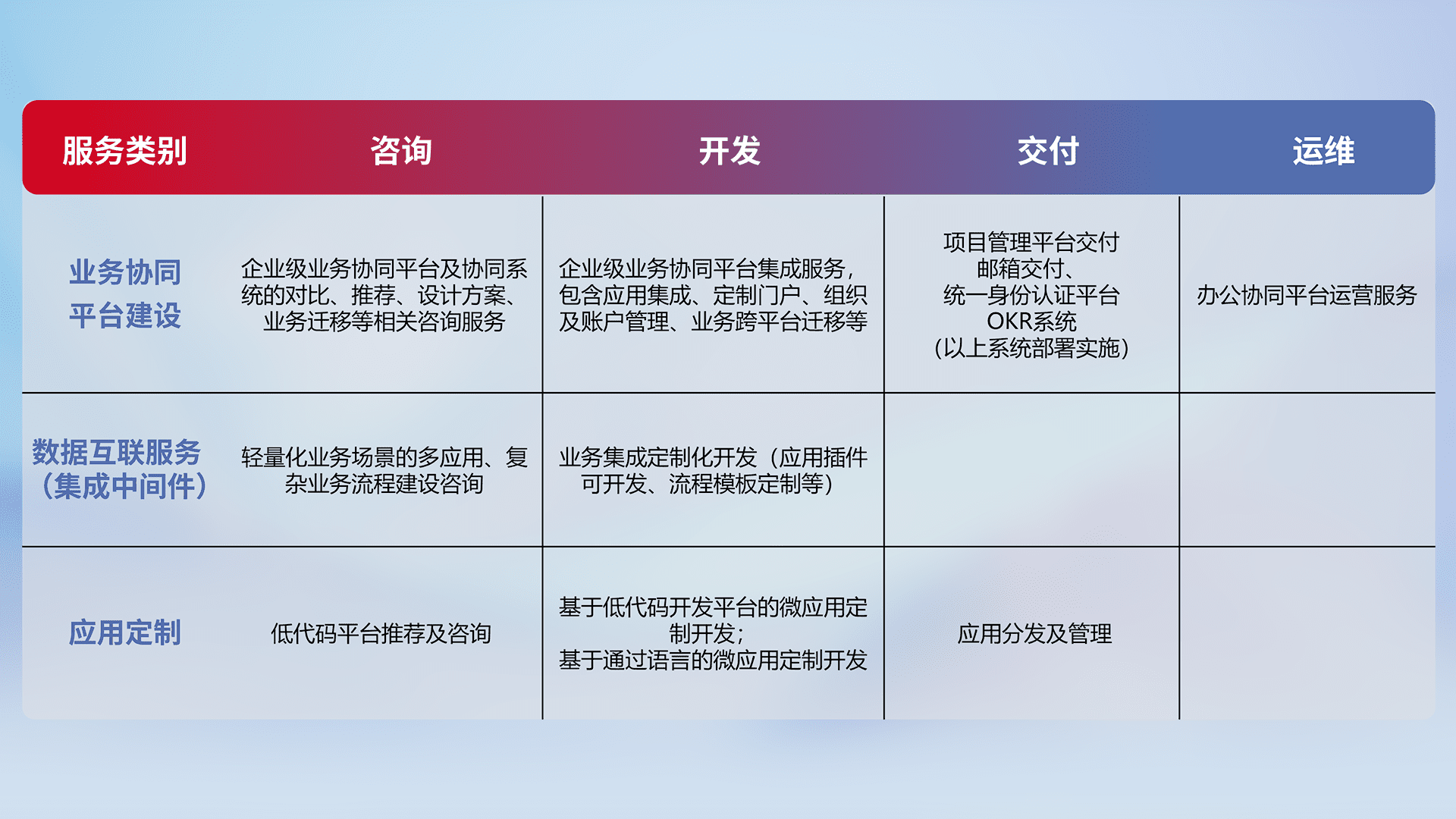 针对钉钉、、、、企微、、、、IDaas等平台级产品提供产品的规划、、方案、、交付、、定制化开发等服务,,,,实现如统一协同办公、、、智能客户服务、、、、混合会议管理、、、智能数据查询、、等业务场景,,实现数字化转型。。
